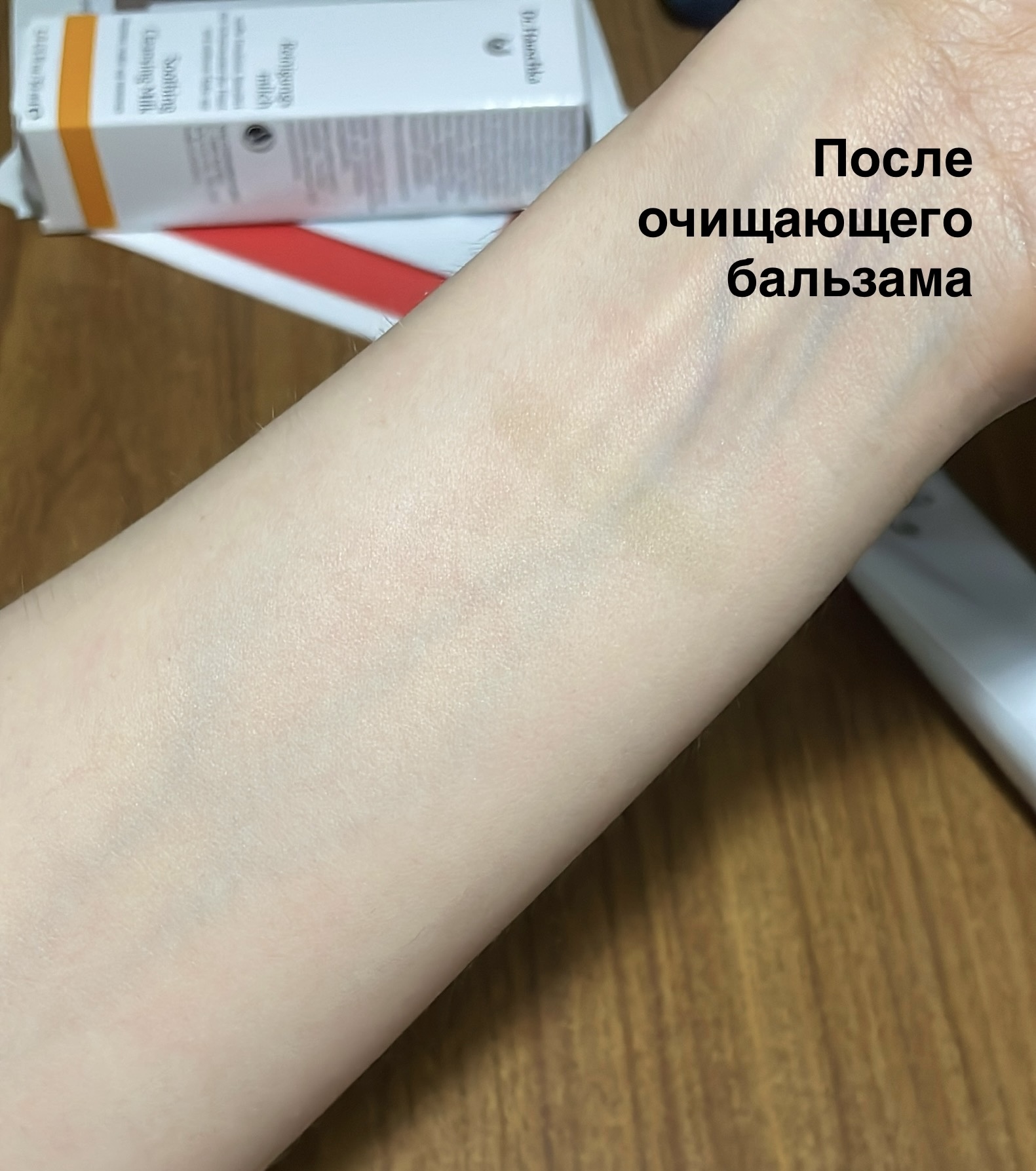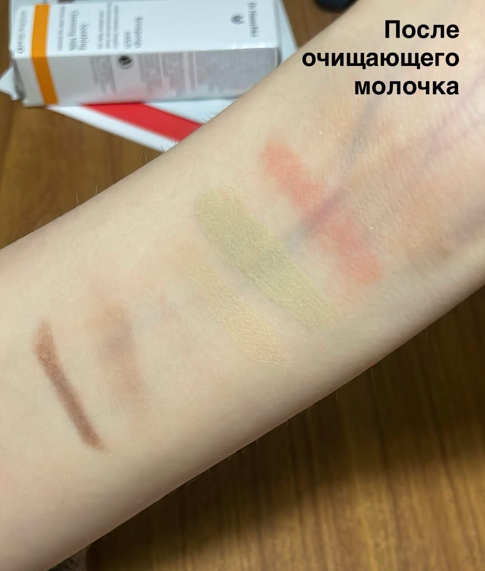 1. Фото: свотчи косметики, через пару минут после нанесения на руку